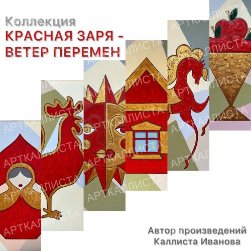 Новая коллекция пропитана глубокими переживаниями и символизмом, проявляющимся на уровне выбранных сюжетов, цветовой палитры и диалога произведений. Автор вкладывает в картины глубокий внутренний интертекст. Сюжеты отсылают зрителя к культурно-историческому наследию русской государственности. В выставочном проекте «КРАСНАЯ ЗАРЯ - ВЕТЕР ПЕРЕМЕН» мы видим неповторимые и самобытные работы, выполненные в необычной технике. Это авторские декоративные панно, которые объединяет сильное чувство любви к родному краю, родной стране и ее общерусской культуре.